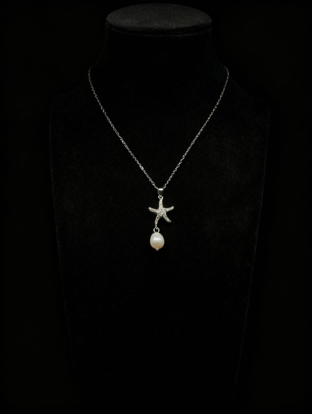 Colier elegant confecționat din argint sterling 925, decorat cu un pandantiv delicat în formă de stea de mare și o perla naturală. Designul combină simbolismul marin cu rafinament clasic, creând o piesă versatilă potrivită pentru ocazii speciale sau purtare zilnică. Argintul de înaltă calitate asigură durabilitate și strălucire de lungă durată, iar detaliile artizanale evidențiază calitatea execuției. Un accesoriu sofisticat care adaugă o notă de eleganță atemporală oricărui outfit.