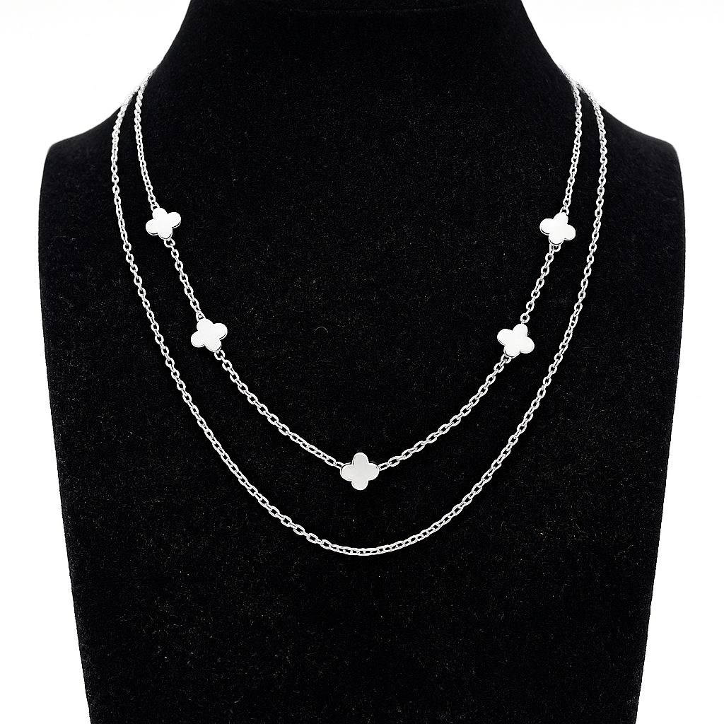 Colier elegant din argint sterling 925, caracterizat prin design dublu care combină motive trifoi delicate cu margele rafinate. Fiecare element este lucrat cu precizie, oferind o piesă versatilă potrivită atât pentru ocazii speciale, cât și pentru purtarea zilnică. Argintul de înaltă calitate asigură durabilitate și strălucire de lungă durată, iar designul sofisticat adaugă o notă de rafinament oricărui outfit.